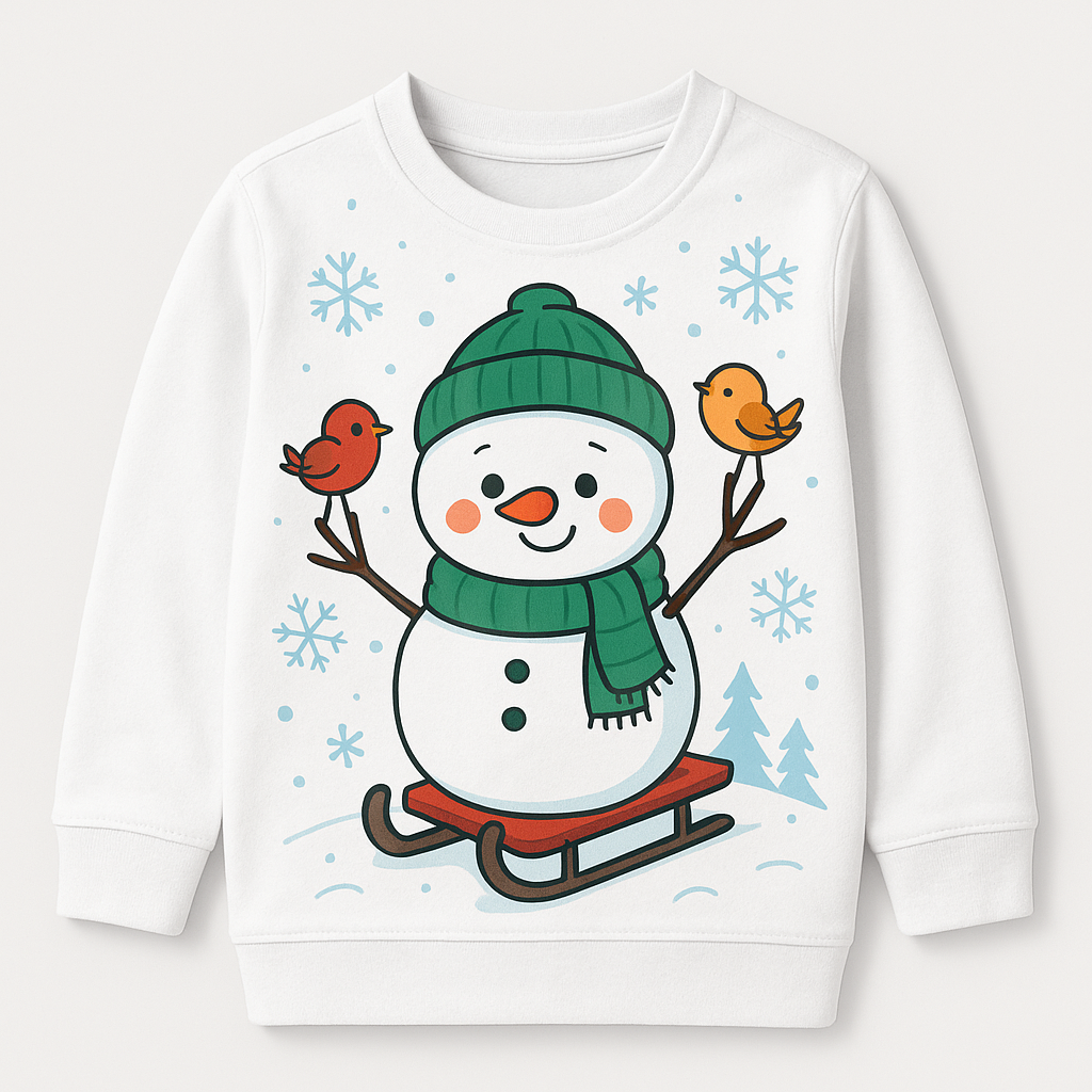Bring winter magic to life with our Frosty Snowman & Friends Kids Jersey! This delightful design features a cheerful snowman in a cozy green hat and scarf, with two little birds perched on his twig arms. Surrounded by soft snowflakes and playful details, this print brings the spirit of the season to every outfit.